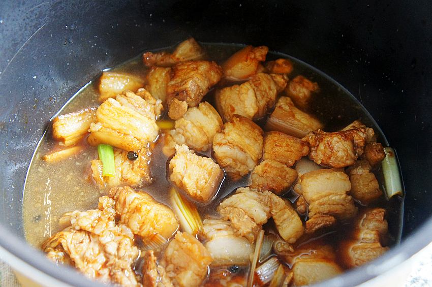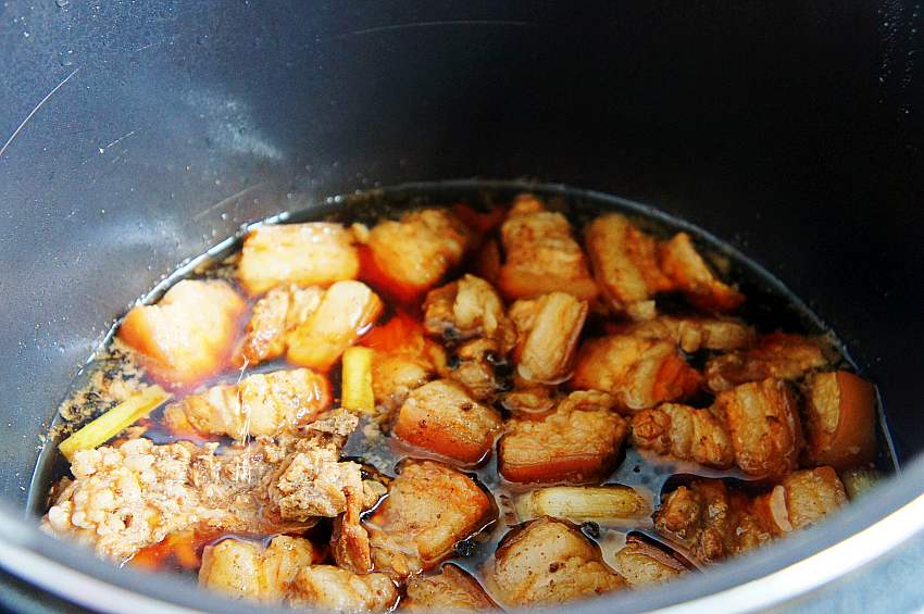 8、炒至五花肉完全上色,倒入压力锅,加入盐、冰糖和适量的开水,如果不想有汤汁的可以不加水,我想用老汤,就多加了一点水,压力锅设置煮肉档,启动电源。