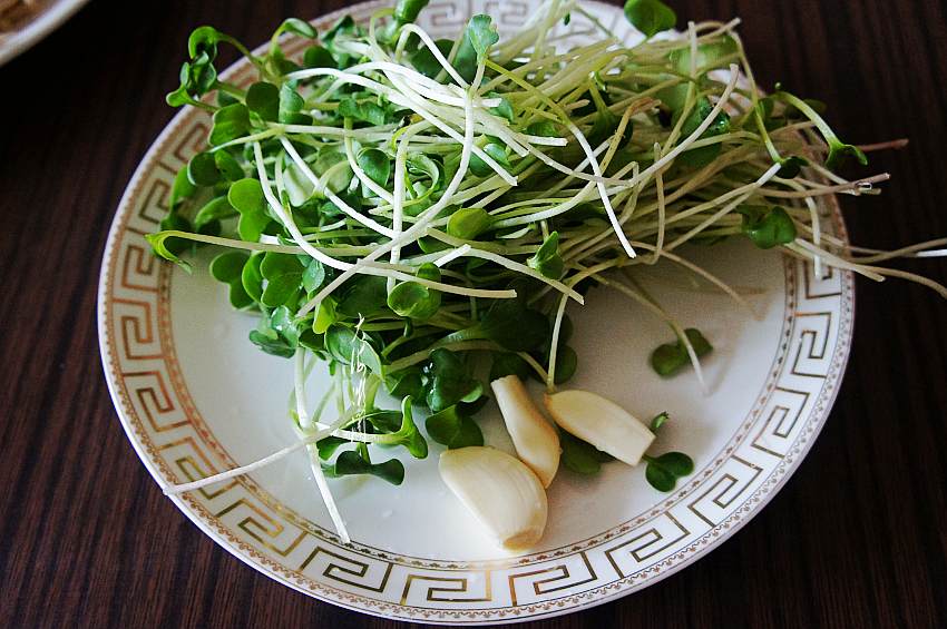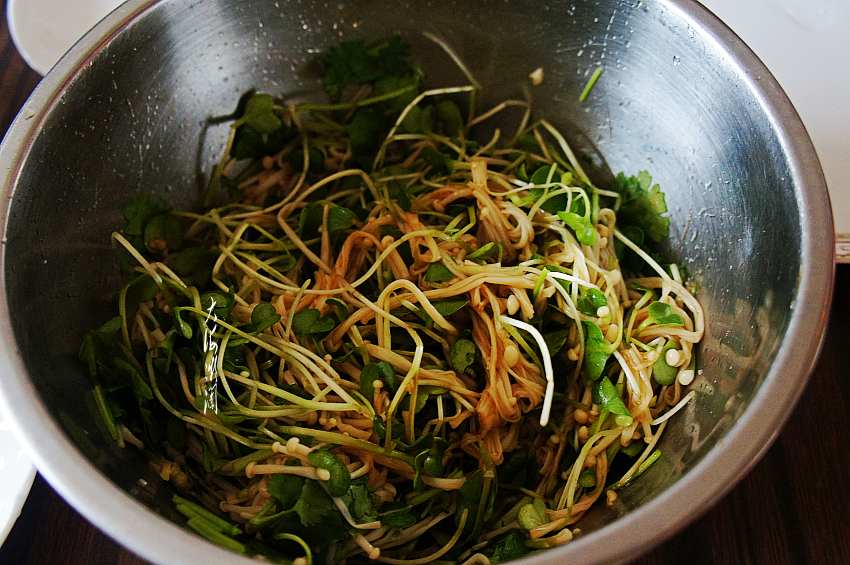【凉拌金针菇萝卜苗】所需食材:萝卜苗1把;金针菇1把;大蒜适量;糖适量;盐适量;醋适量;胡椒粉适量;蘑菇粉适量;花椒油适量;味极鲜酱油少许。