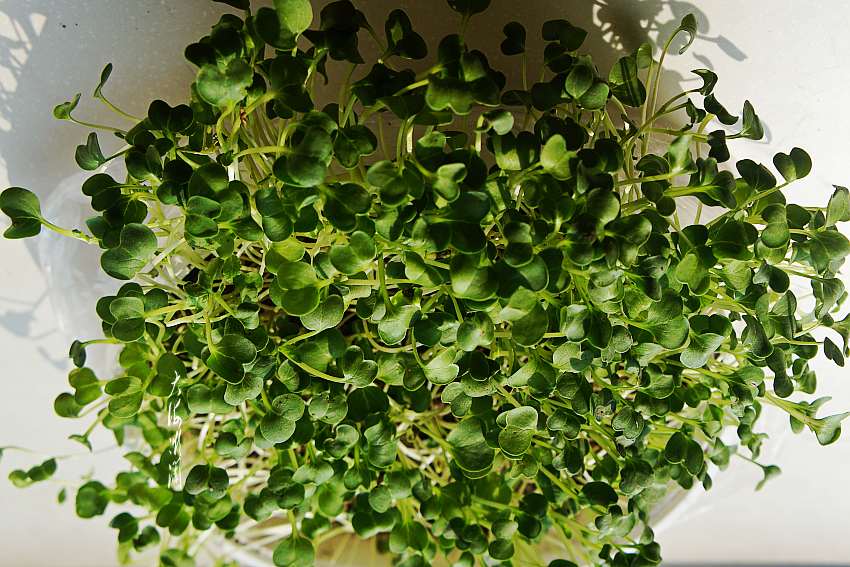 这绿色植物就是萝卜苗,萝卜大家肯定都吃过,但是萝卜种植以后长出的嫩苗估计很多人没见过,其实你也可以在家中的花盆里种植萝卜苗,萝卜籽播种以后长出的新鲜嫩苗也可以食用的,下图就是朋友送来的萝卜苗,色泽嫩绿,口感鲜嫩,有独特的香气。萝卜苗所含热量较少,纤维素较多,营养价值极高,而且吃后易产生饱胀感,有助于减肥瘦身。萝卜苗中的芥子油和精纤维可促进胃肠蠕动,有助于体内废物的排出,常吃对降低血脂、软化血管、稳定血压,预防冠心病等有一定的作用。