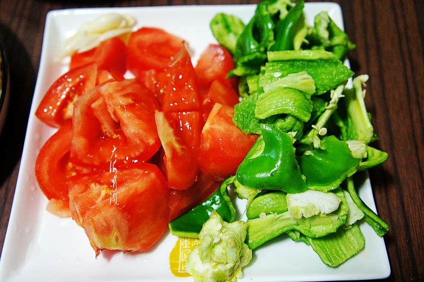 2、西红柿切小块,青椒用手掰成块,大蒜去皮洗净切片。