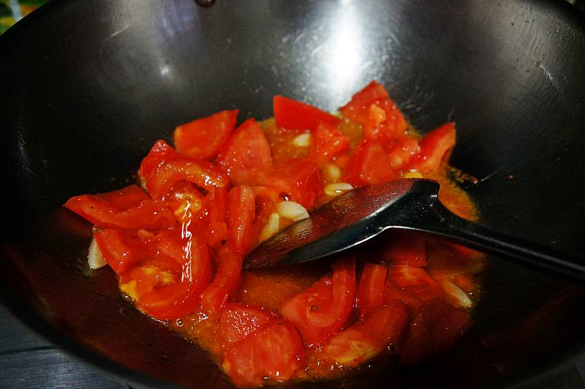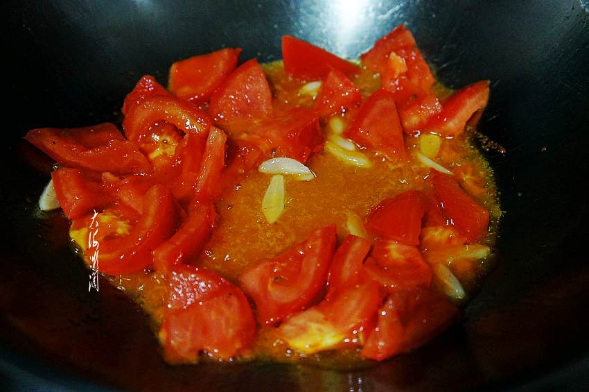 4、锅中加入适量的油,爆香蒜片,下入西红柿翻炒。