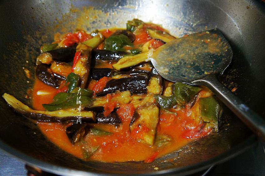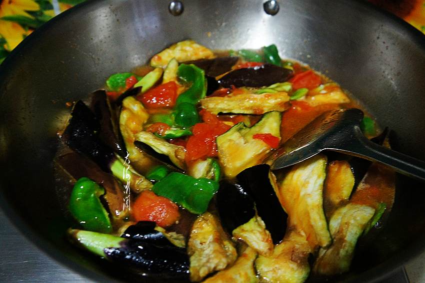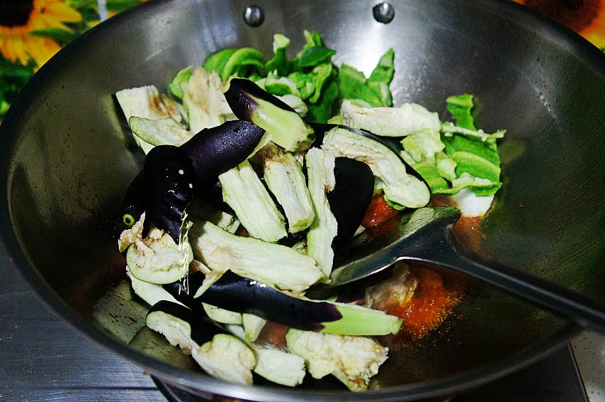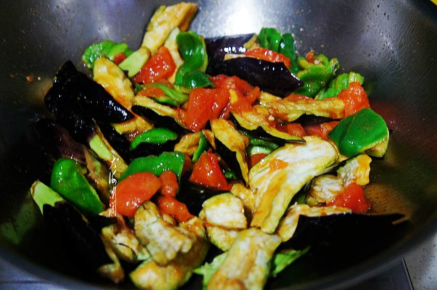 6、加入青椒、茄子翻炒均匀。
