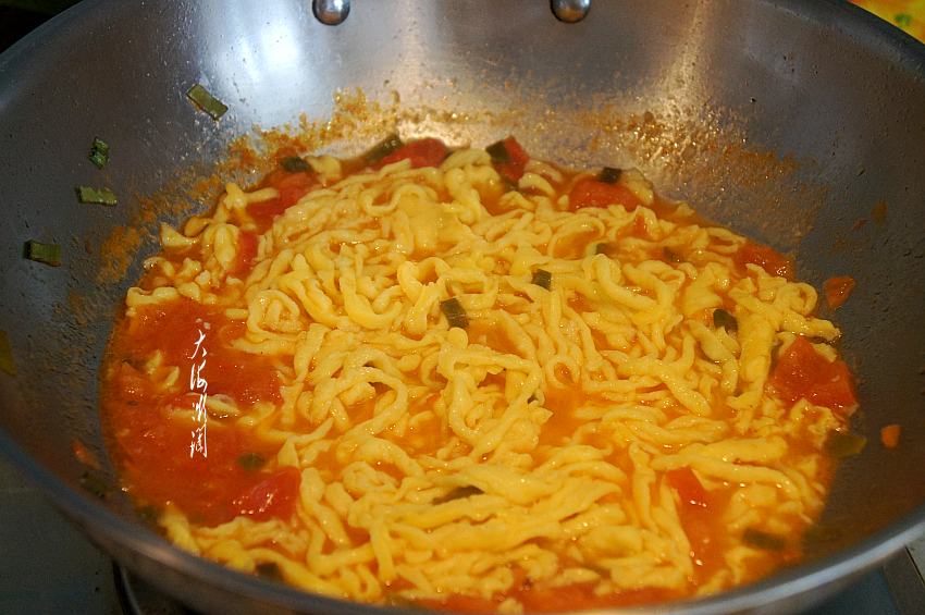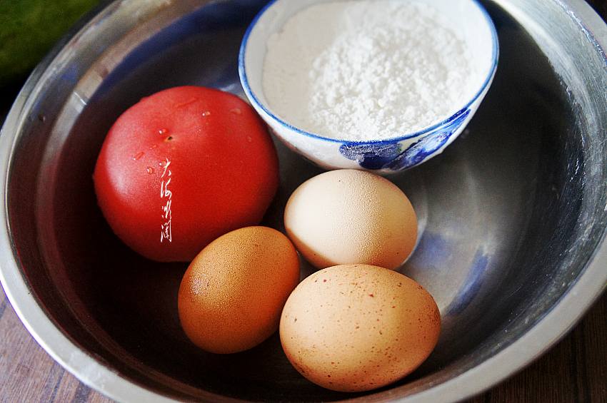 【番茄鸡蛋面】所需食材:鸡蛋3个;番茄1个;面粉90g;葱适量;油适量;盐适量;五香粉适量;胡椒粉适量;味极鲜酱油适量,糖少许。
