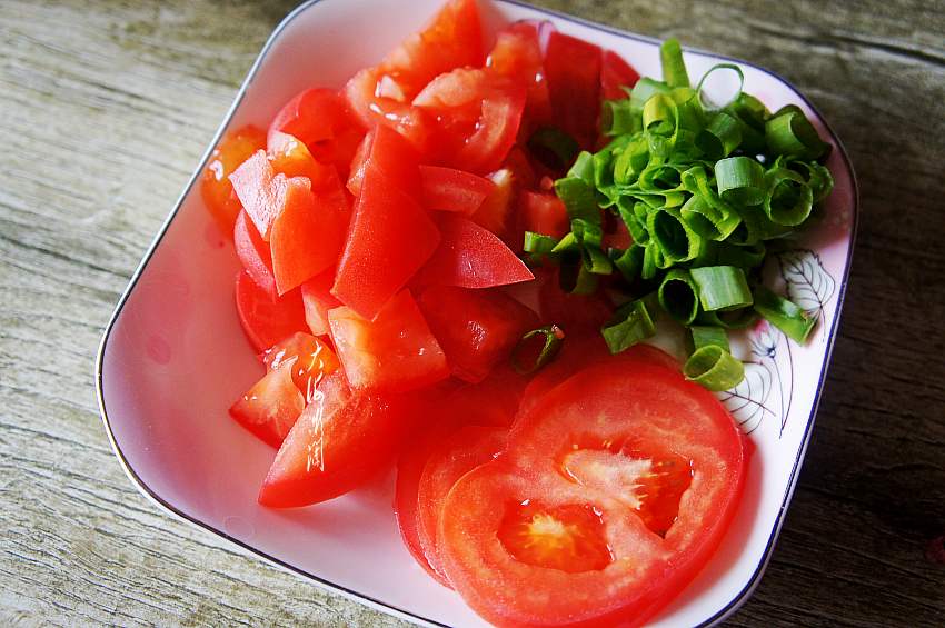 9、出锅,OK啦!放上两篇西红柿,爽口油开胃,撒点葱花,看着而又食欲,喜欢的可以撒点香菜,别有风味。