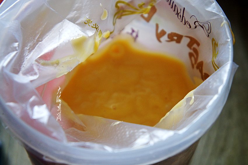 4、取一个高一点的杯子或者罐子,将裱花袋放入杯子中,固定周边,然后将搅拌好面糊装入裱花袋备用。