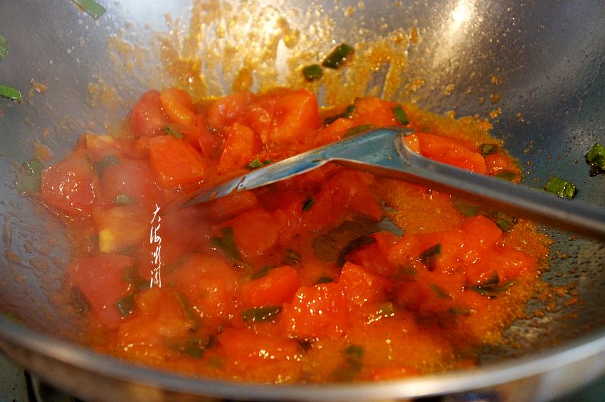 5、炒锅加入适量的油,爆香五香粉和葱花,加入番茄丁翻炒,炒至番茄出来汤汁。