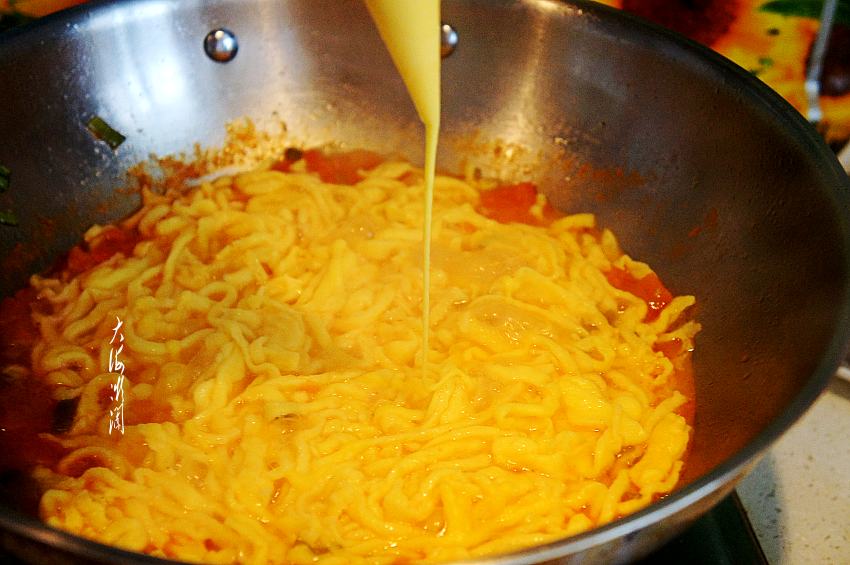 2、一定注意面条要转圈挤,可防止互相粘连,用筷子轻轻滑动,不可太粗暴。调料随自己的喜好添加,这款鸡蛋面有点酸酸甜甜的味道。