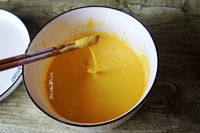 3、鸡蛋打散搅拌均匀,面粉慢慢的加入到蛋液中搅拌至顺滑状态,挑起面糊能能挂住筷子为佳,我用了3个鸡蛋90g面粉,这只是参考量,因鸡蛋大小不同,面粉的用量亦有差别,请根据实际情况调制。