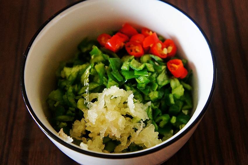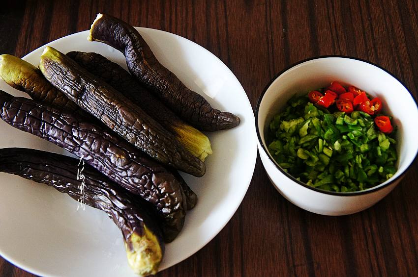 3、蒸好的茄子取出晾凉备用,青椒和辣椒在淡盐水浸泡10分钟后洗净,切碎。