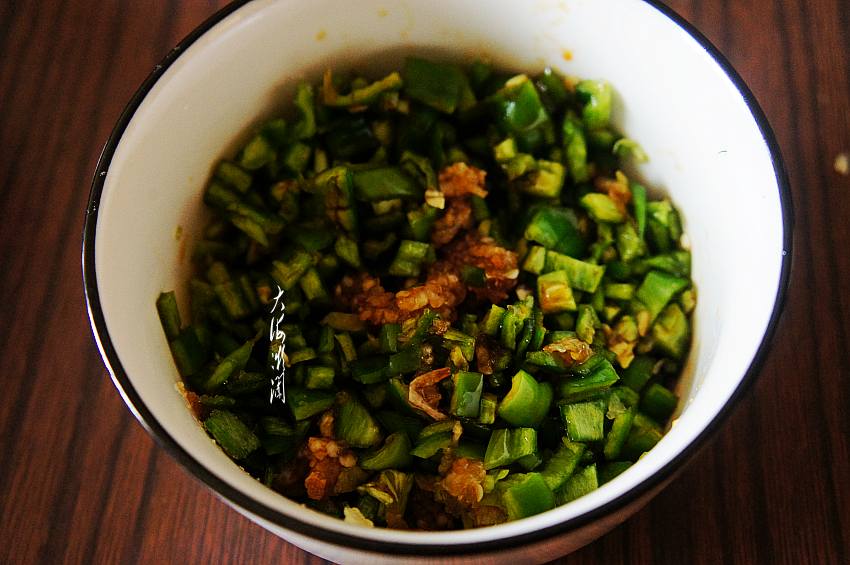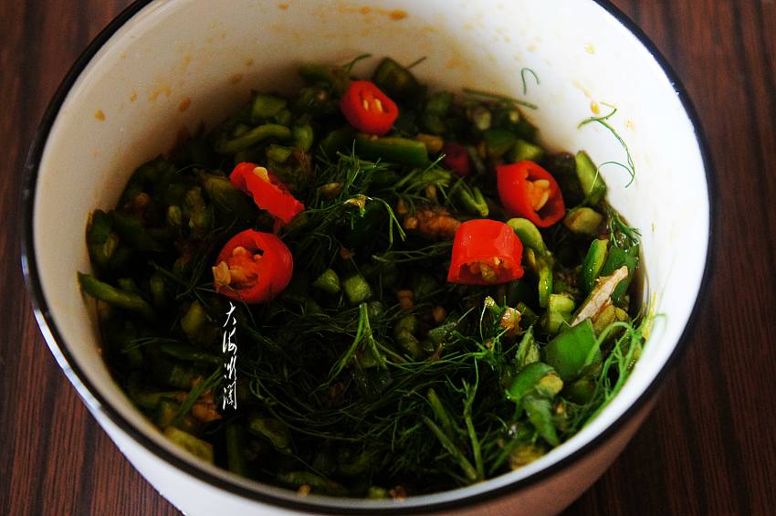 7、加入茴香碎和小米辣拌匀,这里可以加点香菜,香菜四季都有,茴香很少,刚好家里有茴香,拌后味道很独特。