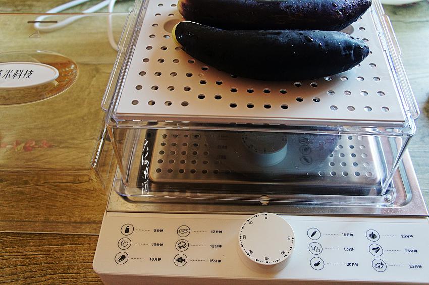 2、将茄子码入电蒸锅,茄子比较大,我用两层屉蒸,电蒸箱水箱注水,盖上蒸盖。注意这款电蒸箱无需预热,10秒钟上汽,速度很快,设置蒸10分钟,启动开关。时间长短与茄子的大小有关系,视情况而定。