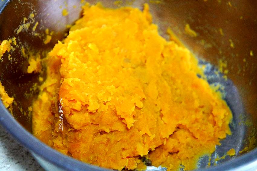 3、趁热用勺子把去皮的红薯块压成红薯泥。