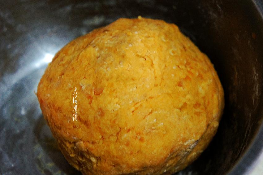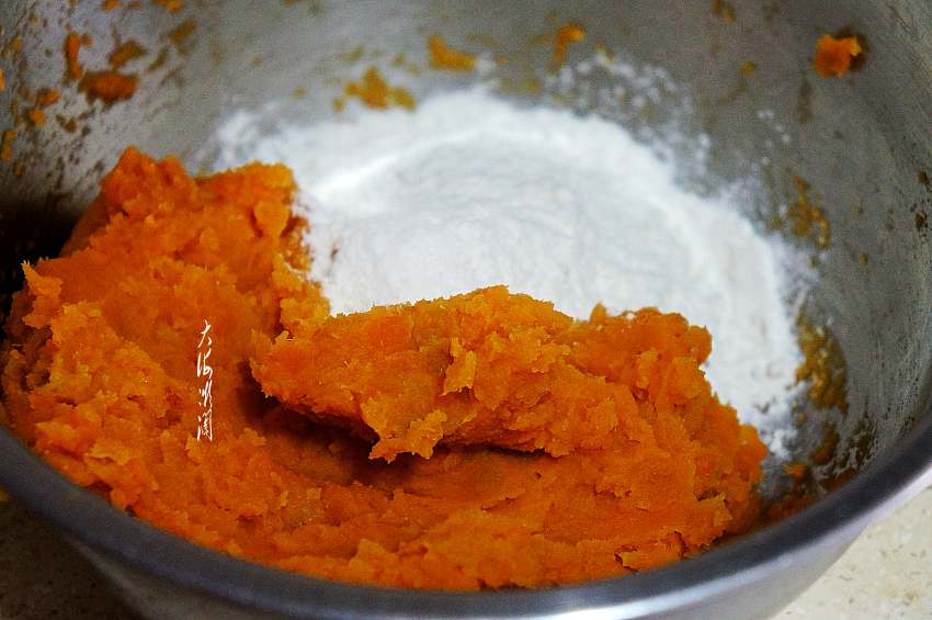 4、加入适量的面粉,面粉用量根据红薯泥的干稀程度不同而变化,能和成面团就好。