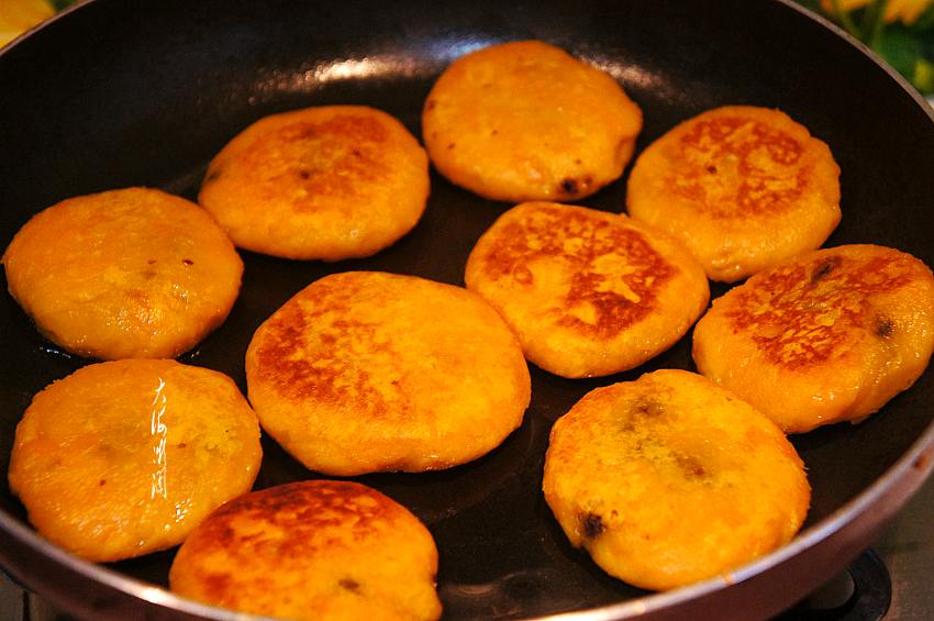 这个红薯饼做法非常简单,都不用面板就能完成,我一说你就会做,绝对零失败。把红薯蒸熟,压成红薯泥,加点面粉和成面团,从面团上揪一块面,用手压扁,加点喜欢的馅料团成球状再压成饼,平底锅刷底油,两面煎熟就OK了。超简单吧,好吃又营养,朋友来了给她品尝,二话没说出锅立即打包带走了,太好吃了,百吃不厌。红薯是很好的低脂肪、低热能食物,含有丰富的淀粉、膳食纤维、胡萝卜素、维生素A、B、C、E以及钾、铁、铜、硒、钙等10余种微量元素和亚油酸,大量的膳食纤维,在肠道内无法被消化吸收,能刺激肠道,增强蠕动,通便排毒,防止亚健康,同时又能有效地阻止糖类变为脂肪。红薯已被营养学家当作一种药食兼用,营养均衡的食品,它的热量只有同等重量大米所产生热量的三分之一,而且几乎不含脂肪和胆固醇。常吃红薯有益于人体健康,并有一定的减肥作用,早、晚餐吃它更适合。