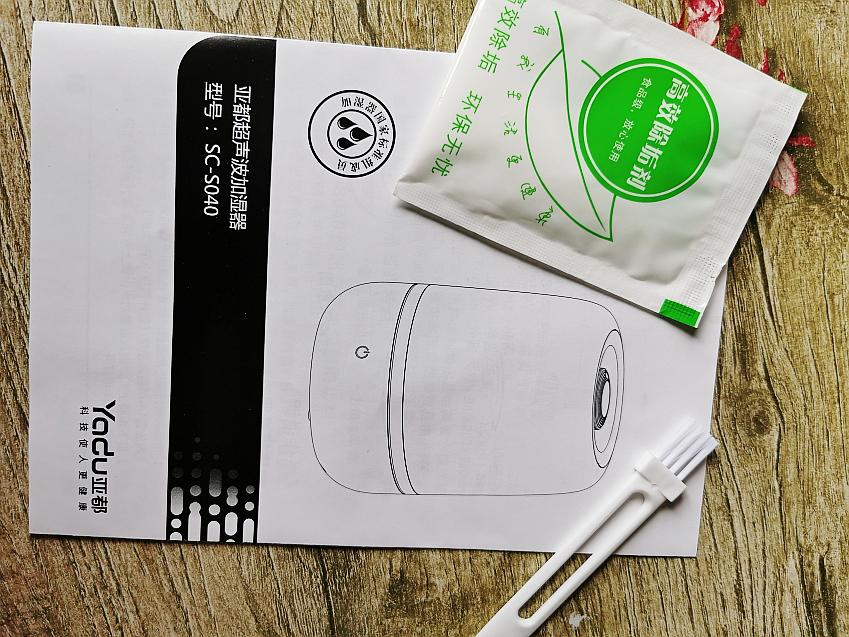 随机附有产品说明书一份,清洗加湿器的小刷子1把。赠送食用级高效除垢剂一包。