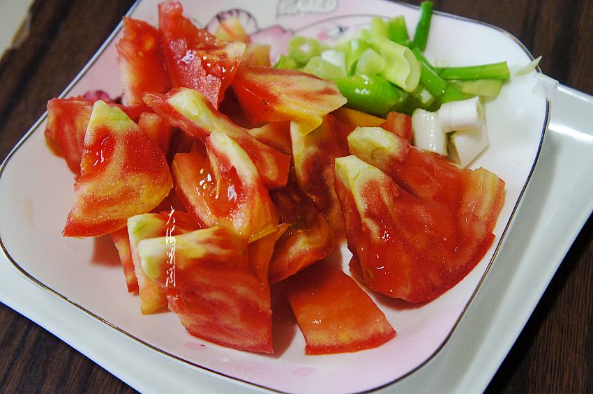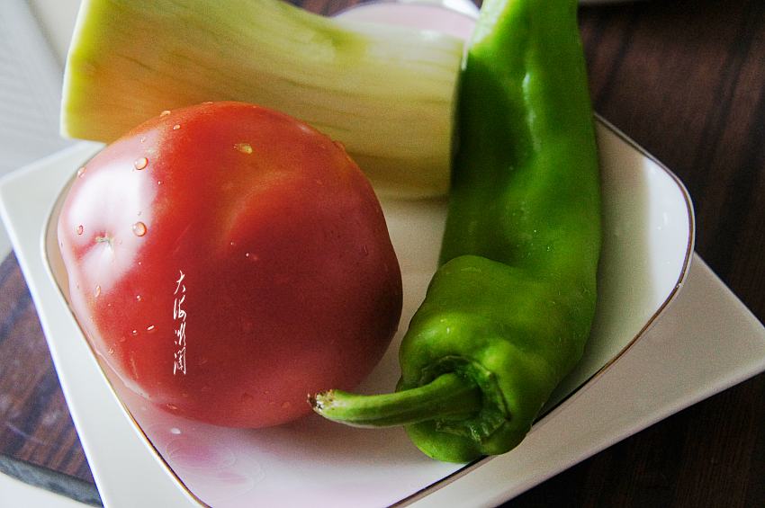 做法及步骤: 1、准备食材,西红柿淡盐水中浸泡10分钟,反复清洗干净,角瓜和辣椒都是从姐家拿来的,自家种植的绿色蔬菜,没有农药没有化肥,洗干净就好。