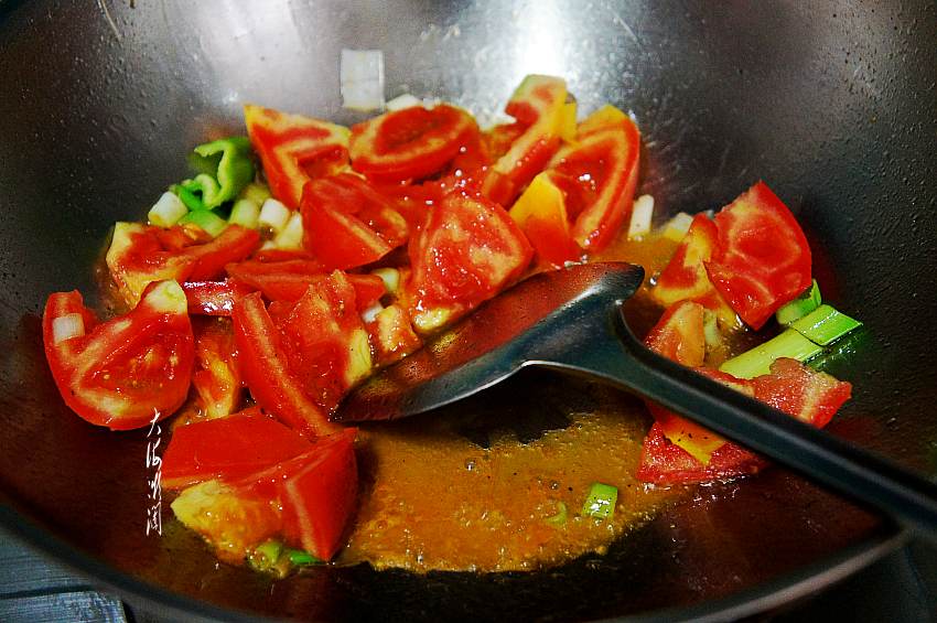 4、炒锅加入适量的油,爆香五香粉和葱花,下入西红柿翻炒,炒至西红柿出浓厚的汤汁。