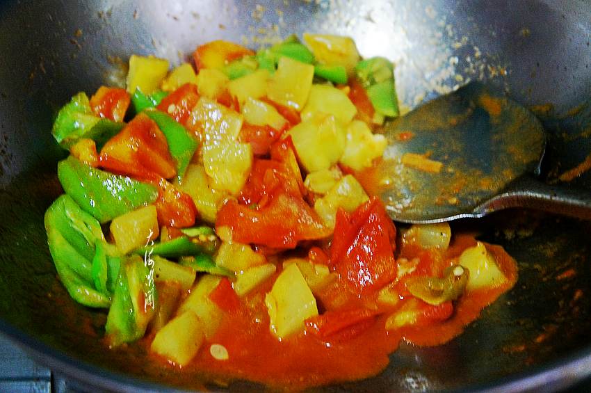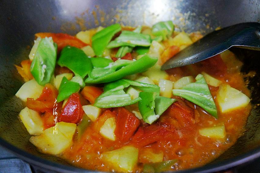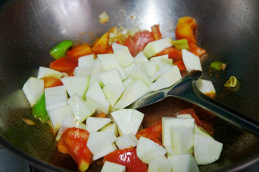 6、翻炒均匀后,加入半碗水炖一下,不用盖锅盖,角瓜很容易熟。