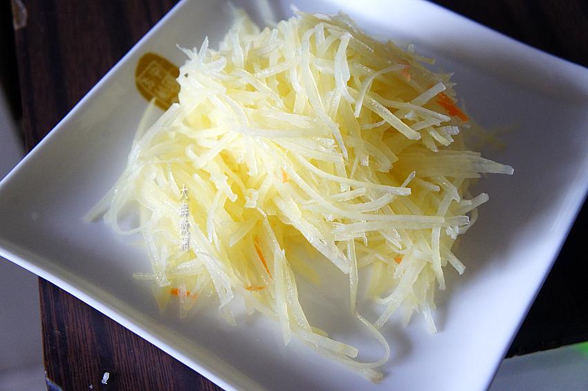 3、锅中加入适量的水,水开下入芹菜,焯水后捞出过冷水;然后下入土豆丝,焯水后捞出过冷水,最后下入胡萝卜丝,焯水后捞出过冷水。
