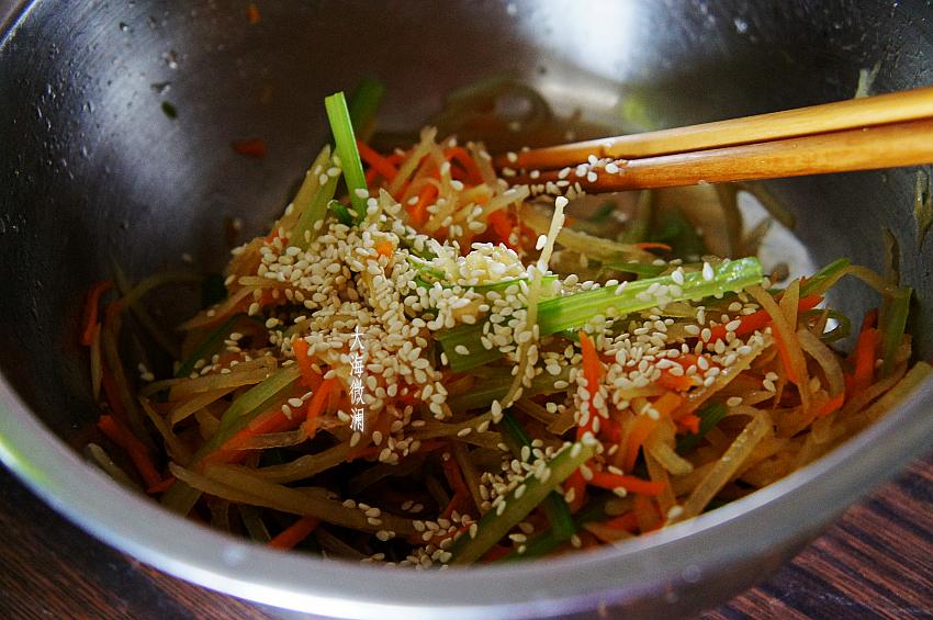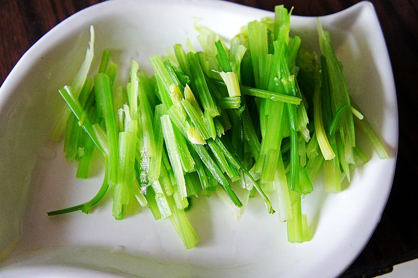 5、过冷水的芹菜捞出控净水分,切成细丝。