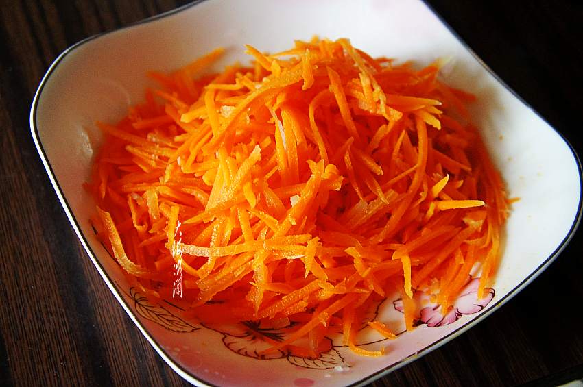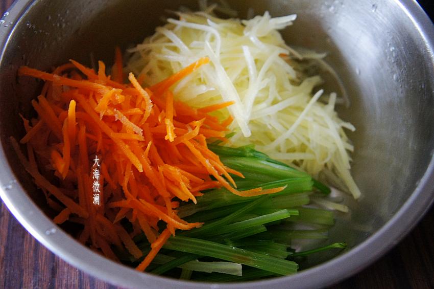 7、取大盆,加入控净水分的土豆丝、胡萝卜丝和芹菜丝。