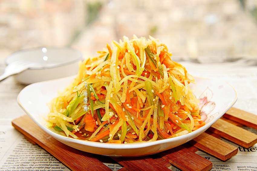 这菜看着是不是特别有食欲,食材都是极其简单的家常菜,土豆、胡萝卜和芹菜,这三样食材目前可都是物美价廉的菜,现在的单价都低于1元钱,这道菜饭店怎么也要十几二十元,在家自己做2元钱足够,做法超级简单,三种食材分别切丝或者擦丝,过水焯一下然后一拌就OK了!10分钟就上桌,好看好吃还有营养。颜色搭配也漂亮,土豆被称为“十全十美”的食物,低脂肪、低热量,也是众所周知的抗衰老的食物,有很好的呵护肌肤、保养容颜的作用,同时因含有丰富的膳食纤维可以起到通便排毒和清肠刮油的作用。而多食芹菜有利于安定情绪,消除烦躁。搭配素有“小人参”之美称的胡萝卜不仅养肝明目,降糖降脂,其中的维生素A是骨骼正常发育的必需物质,这菜平时要多给孩子吃。