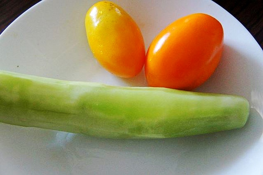 做法及步骤:1、准备食材,黄瓜和番茄洗净备用。这是刚刚从姐家拿来的自家种植的黄瓜和番茄,纯绿色食材,这个黄瓜品种不一样,皮有点厚,选择去皮,可以不去皮的。