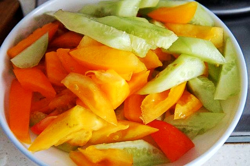 2、根据自己喜欢的口感,黄瓜切块,西红柿切块。