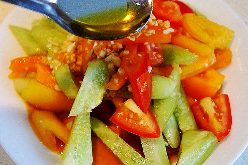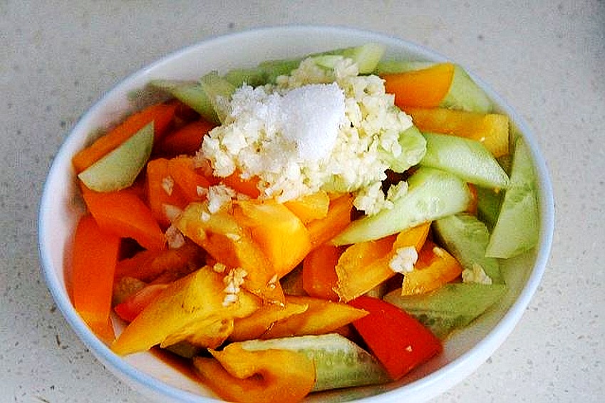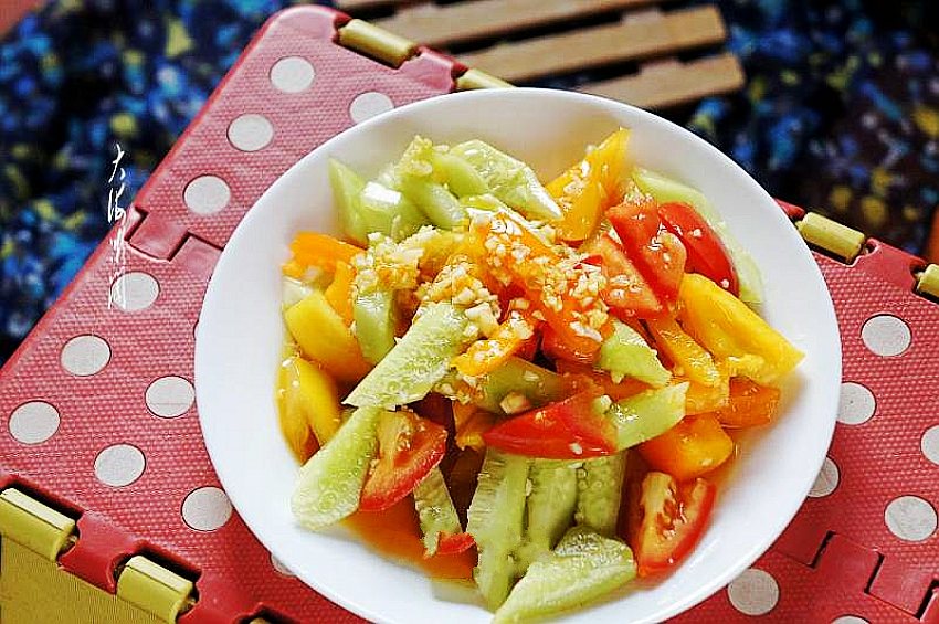 【凉拌黄瓜番茄】所需食材:黄瓜1根;番茄2个;大蒜适量;白糖适量;苹果醋适量 ;味极鲜酱油适量;盐少许。