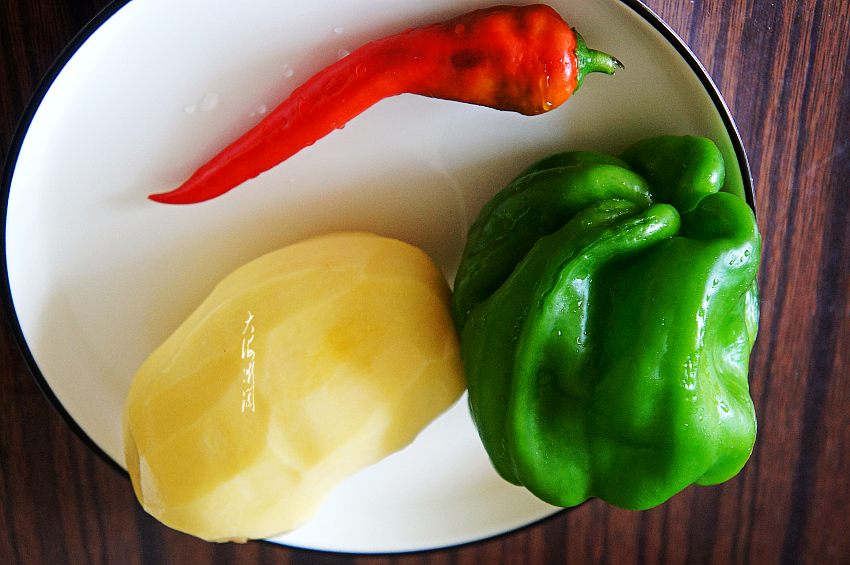 2、青椒和辣椒分别切块。土豆切片,冷水浸泡10分钟以上,要泡出淀粉,也是很关键的一步,有人说我家从来都不泡,那你炒出来的土豆片就容易黏糊糊的,再炒就碎了,你可以试试泡水后的效果。