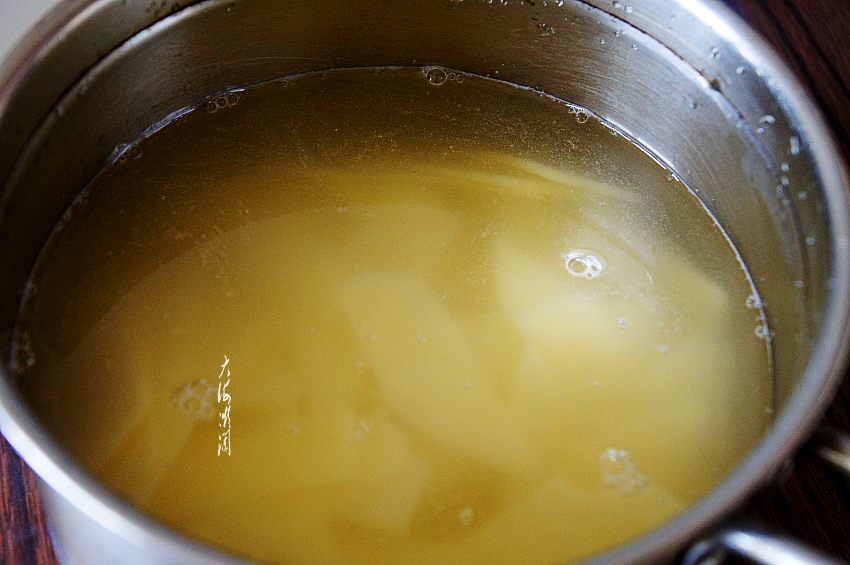 2、青椒炒土豆片好吃的关键一步,土豆片和青椒炒至大约七成熟时,加入少许浸泡土豆片的水,让土豆片和青椒熟透,略有芡汁的作用,口感更好。