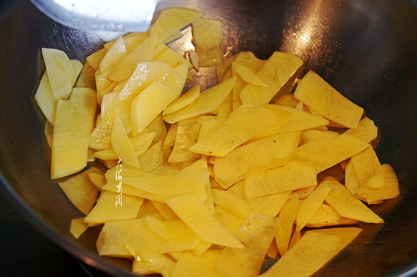 3、土豆片捞出控净水分,炒锅加入适量的油,爆香五香粉和蒜片,加入控净水分的土豆片翻炒。