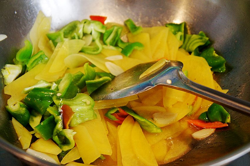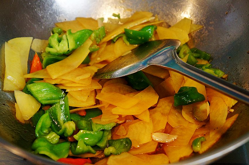 4、待土豆片变色加入青椒翻炒。