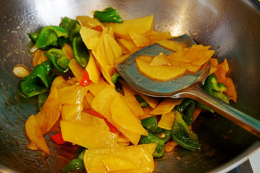 5、关键的一步来了,土豆片和青椒炒至大约七成熟时,加入少许浸泡土豆片的水,让土豆片和青椒熟透,略有芡汁的作用。