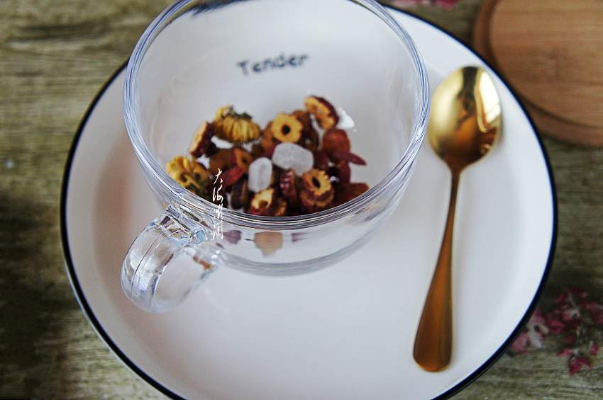 【菊花红枣枸杞茶】所需食材:菊花2朵;红枣枸杞茶1包。