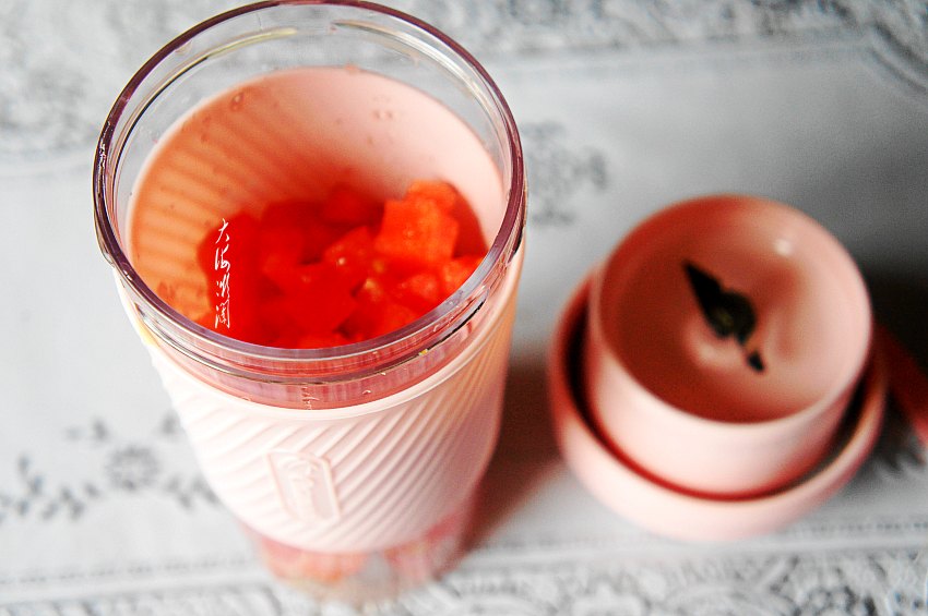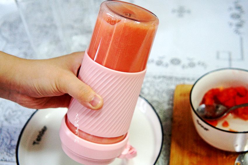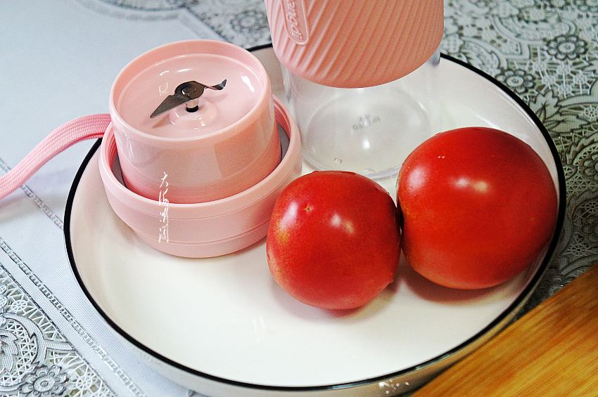做法及步骤:1、买回来的新鲜西红柿用果蔬清洗剂浸泡后,清洗干净,或者用淡盐水浸泡后清洗干净,因为要带皮生吃一定要清洗好。现在的便携式果汁机品种很多,特别方便,榨果汁越来越轻松,一次充电,可以榨很多杯果汁,特别适合旅行携带,既能榨汁,还可以当水杯用,而且榨果汁不出渣,榨出来的果汁富含粗纤维,不但促进消化,清理宿便,减肥瘦身,而且营养更加丰富,还能美容养颜。