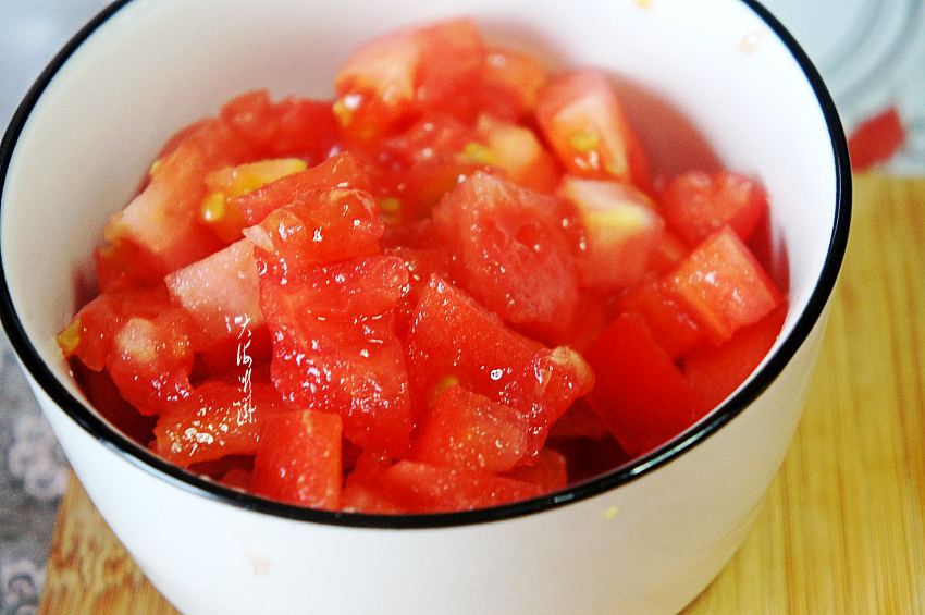 2、将洗净的西红柿切丁,大约1cm见方的丁或者更细小一点,这样更容易打碎。