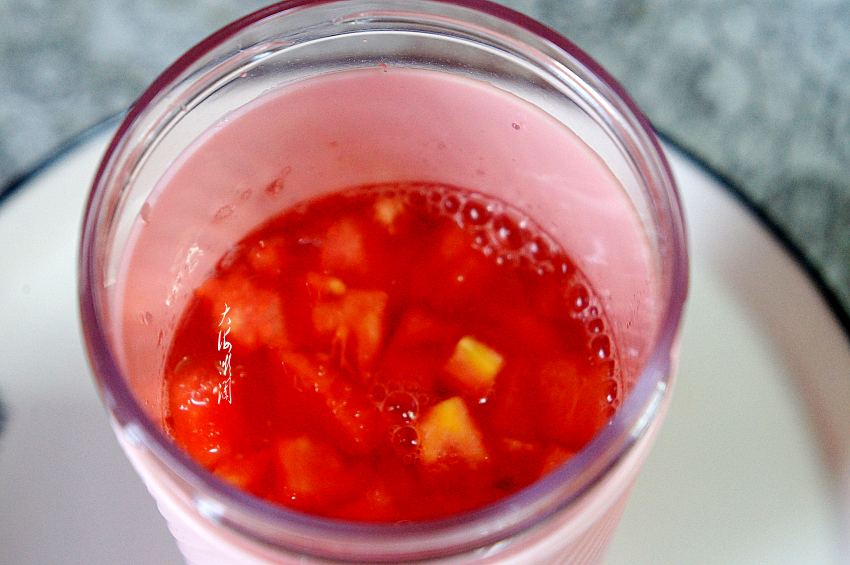 3、将西红柿丁放入搅拌杯,喜欢甜口的可以加点糖,想减肥的就不要加糖了,这季节的西红柿甜面的都起砂,口感特别好,不加糖也很好喝,我家小朋友都拒绝加糖。