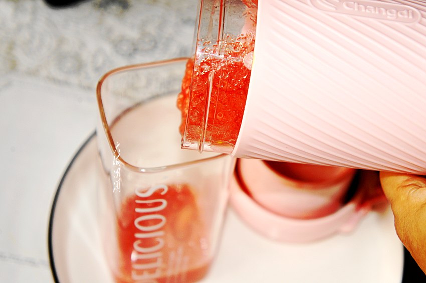 6、榨好的番茄汁倒入杯中即可饮用,也可以不出杯,直接饮用,随个人喜好吧。