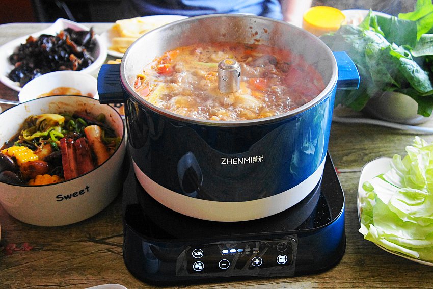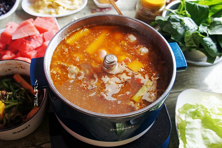 2、这火锅汤汁看着就有食欲吧,倒入火锅,设置高温烧开就OK了。接下来就可以下入耐煮的配料,比如各种肉丸、火腿、香菇等,然后根据自己的喜好下入羊肉、蔬菜,其实涮火锅没有先后顺序,自家吃喜欢吃啥就入锅涮啥,边煮边吃,再榨杯果汁,解腻开胃,真是好吃到撑。