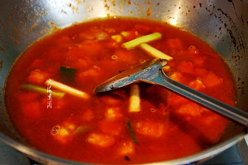做法:1、这是我家自制的火锅底料,算是独家秘方吧,超简单,2个番茄洗净切块,切点葱段蒜片,炒锅加入适量的油,爆香葱蒜片和豆瓣酱,加入番茄翻炒至汤汁浓郁,加入适量的水烧开。