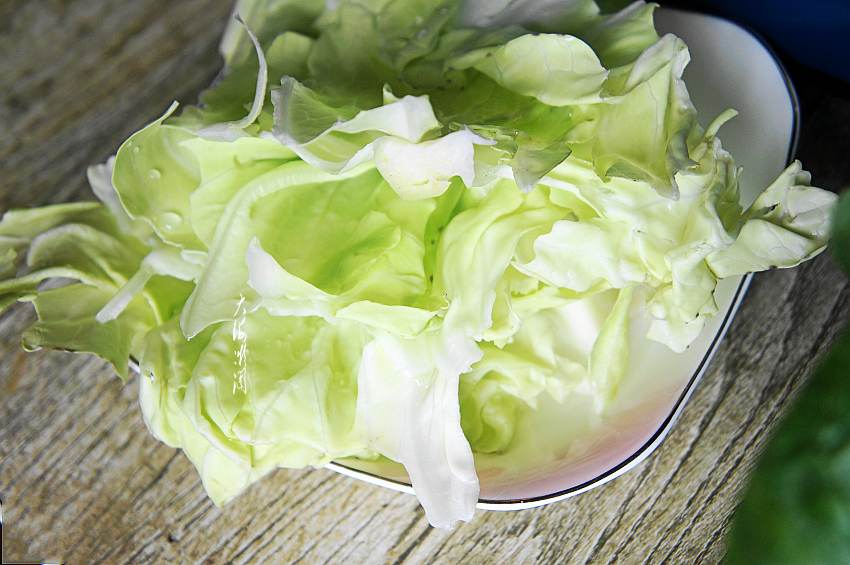 10、甘蓝菜,洗净用手撕成块,记着别用刀切,口感不好。