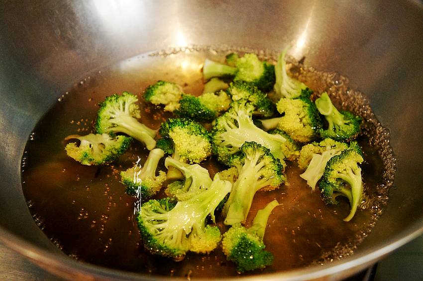 4、水开再滴几滴油焯烫西兰花,加盐和滴油都能保持蔬菜的颜色不变。