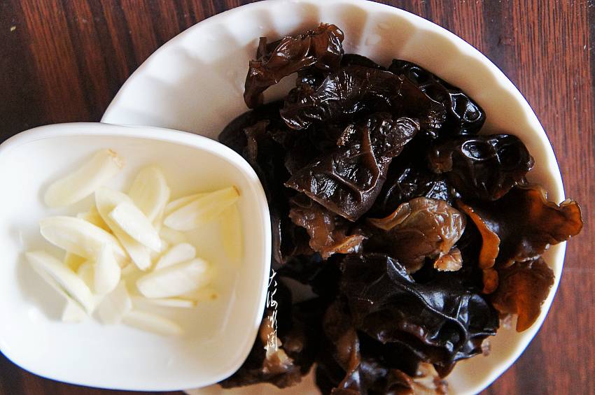 5、大蒜去皮洗净,切片,黑木耳撕成小块,控净水分。