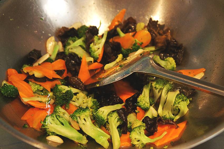 8、再把西兰花和黑木耳倒入翻炒均匀。