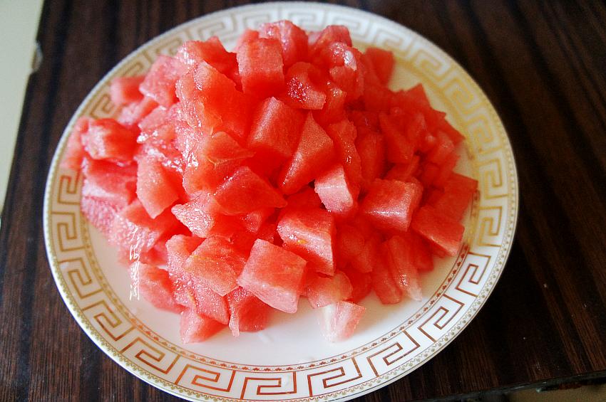 2、西瓜切1厘米大小见方的丁,可以更大一点,西瓜容易榨汁,注意去掉西瓜子。