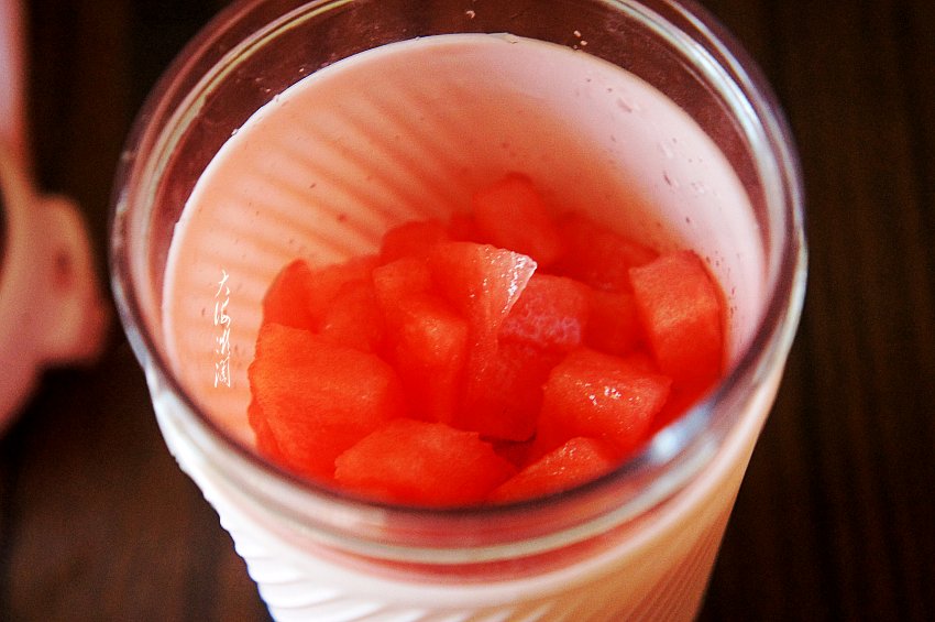 3、将西瓜丁放入搅拌杯,这季节的西瓜特别甜,什么都不要加,原汁原味,爽口开胃。