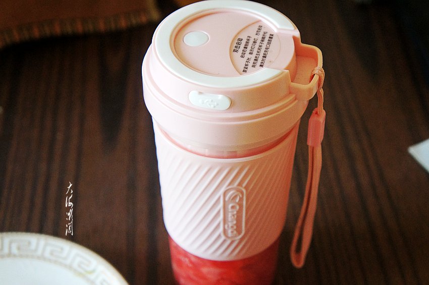 6、双击开关启动电源,注意将果汁机缓慢倒置手持,以45度角摇晃,单次工作时长是38秒,榨西瓜汁1次即可完成,口感特别爽。