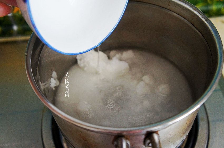 2、取不锈钢奶锅,加入白糖,加入纯净水,搅拌均匀,开火煮沸转小火慢慢熬煮。