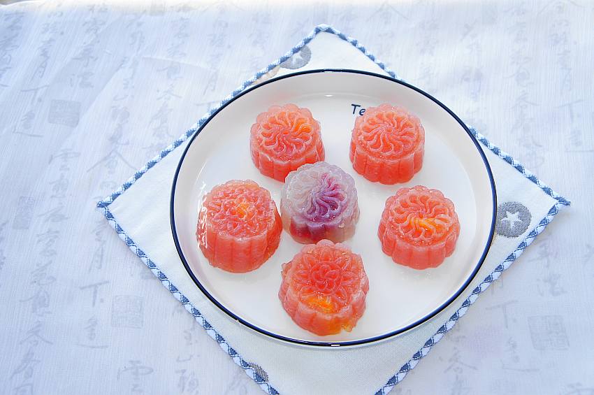 13、晶莹剔透的月饼出锅装盘。这款月饼是不是没有难度,明天就过节了,赶紧动手做给家人吃吧。